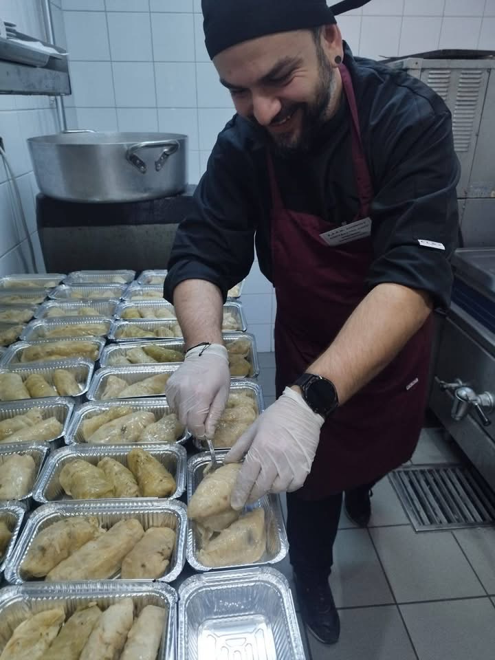 Με τη χορηγία της Ιεράς Μητρόπολης όλων των απαραίτητων υλικών, οι έμπειροι σεφ – εκπαιδευτές της ΣΑΕΚ, κ. Χρήστος Ντίνος και κ. Γιώργος Κιουρανάκης, μαζί με τους σπουδαστές του Τμήματος, μαγείρεψαν 200 γεύματα αγάπης στην επαγγελματική κουζίνα του Νοσοκομείου Λήμνου, η οποία αξιοποιείται για την πραγματοποίηση των εργαστηριακών μαθημάτων Μαγειρικής της Σχολής.