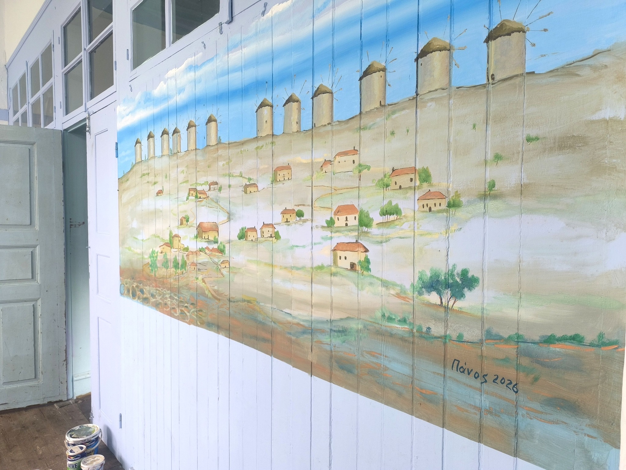 Με τα πινέλα και τις μπογιές του, αλλά κυρίως με τη βαθιά του σύνδεση με τον τόπο, ο Παναγιώτης μετέφερε στο εσωτερικό του χώρου ένα σημαντικό τοπόσημο του χωριού!