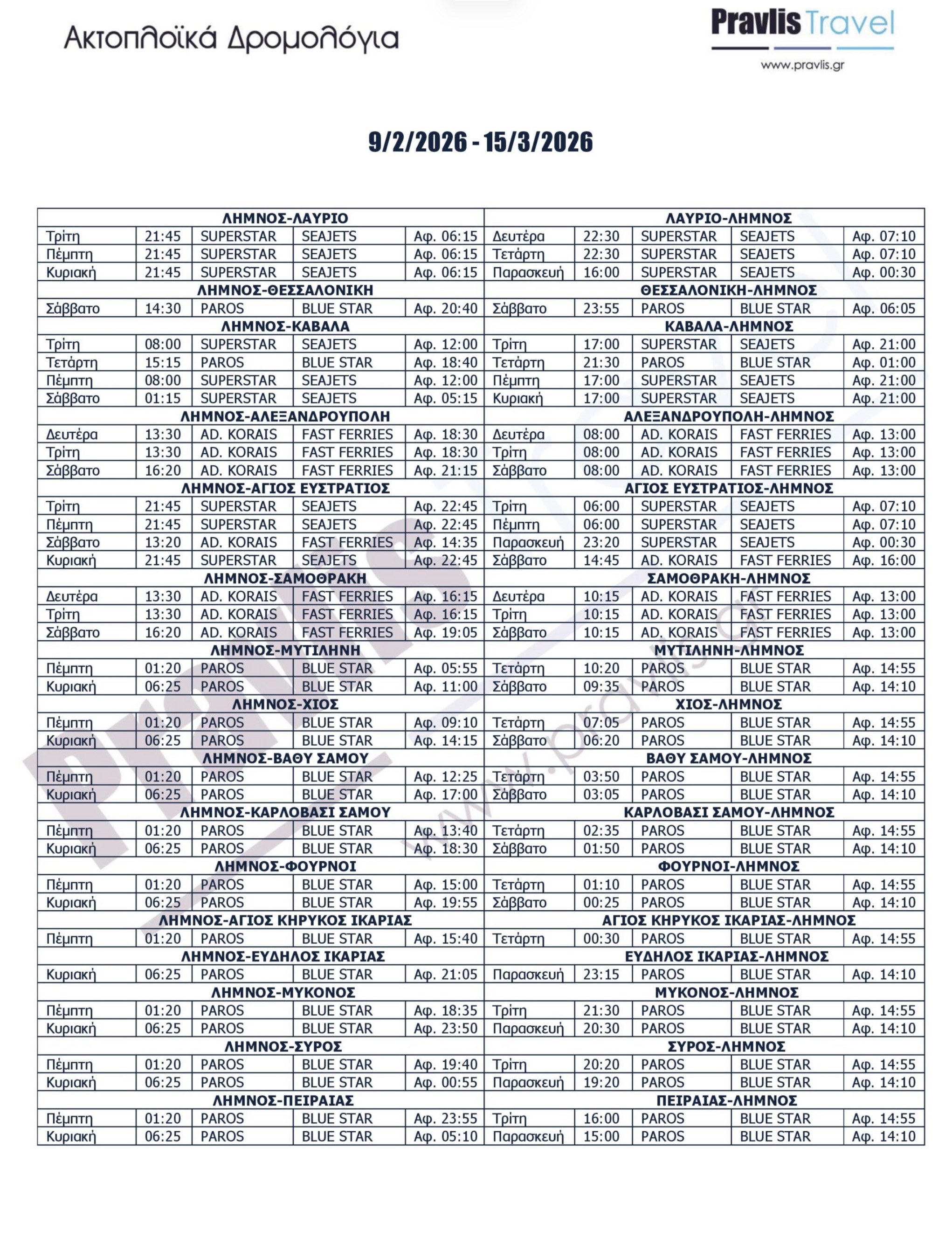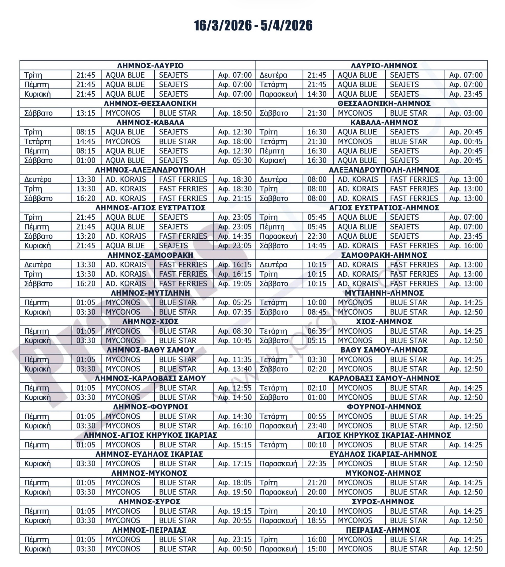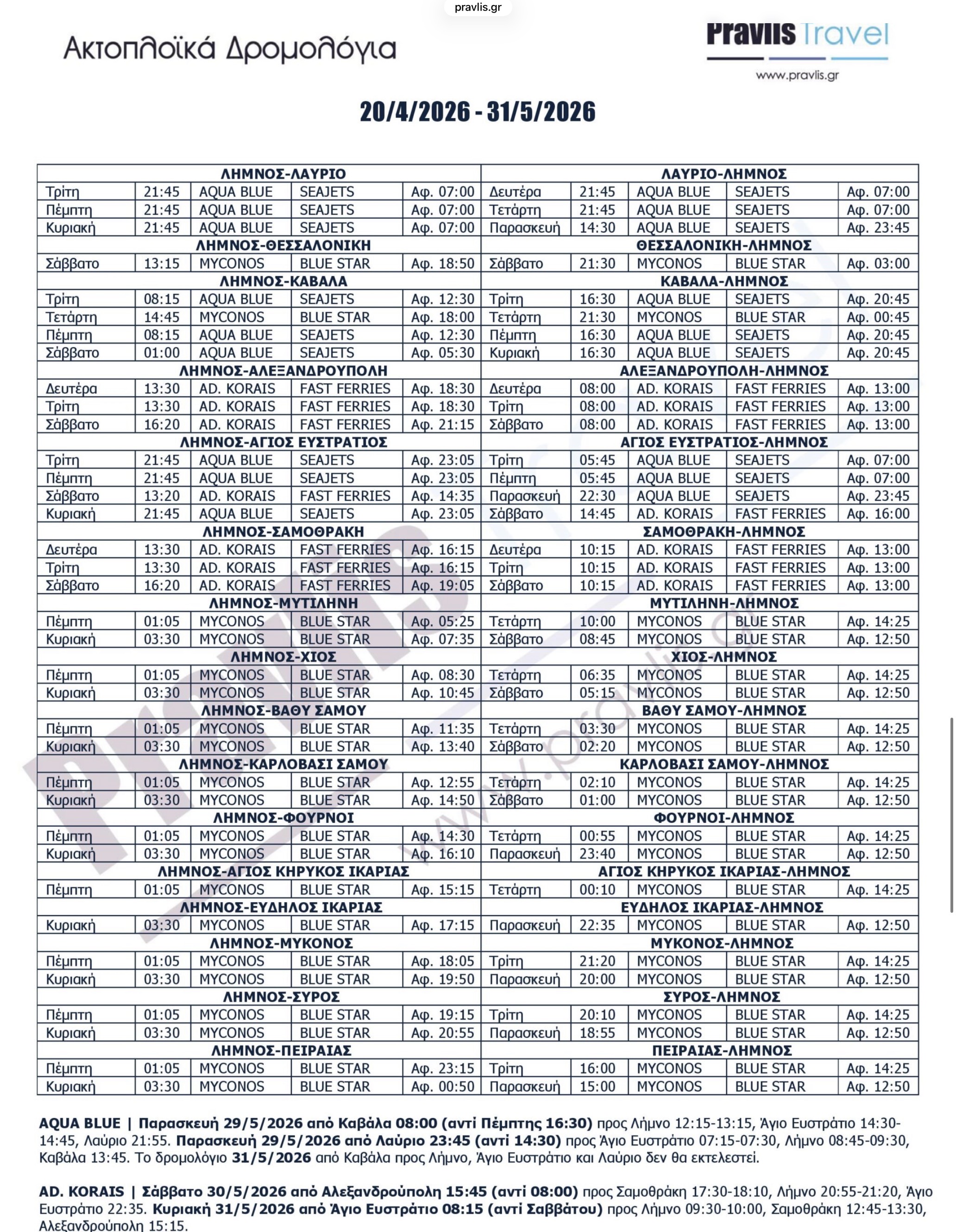 Σημειωτέον, από τα μέσα Μαρτίου, στη γραμμή Λαύριο–Λήμνος επανέρχεται το Aqua Blue της SeaJets, το οποίο αναλαμβάνει τα καλοκαιρινά δρομολόγια!