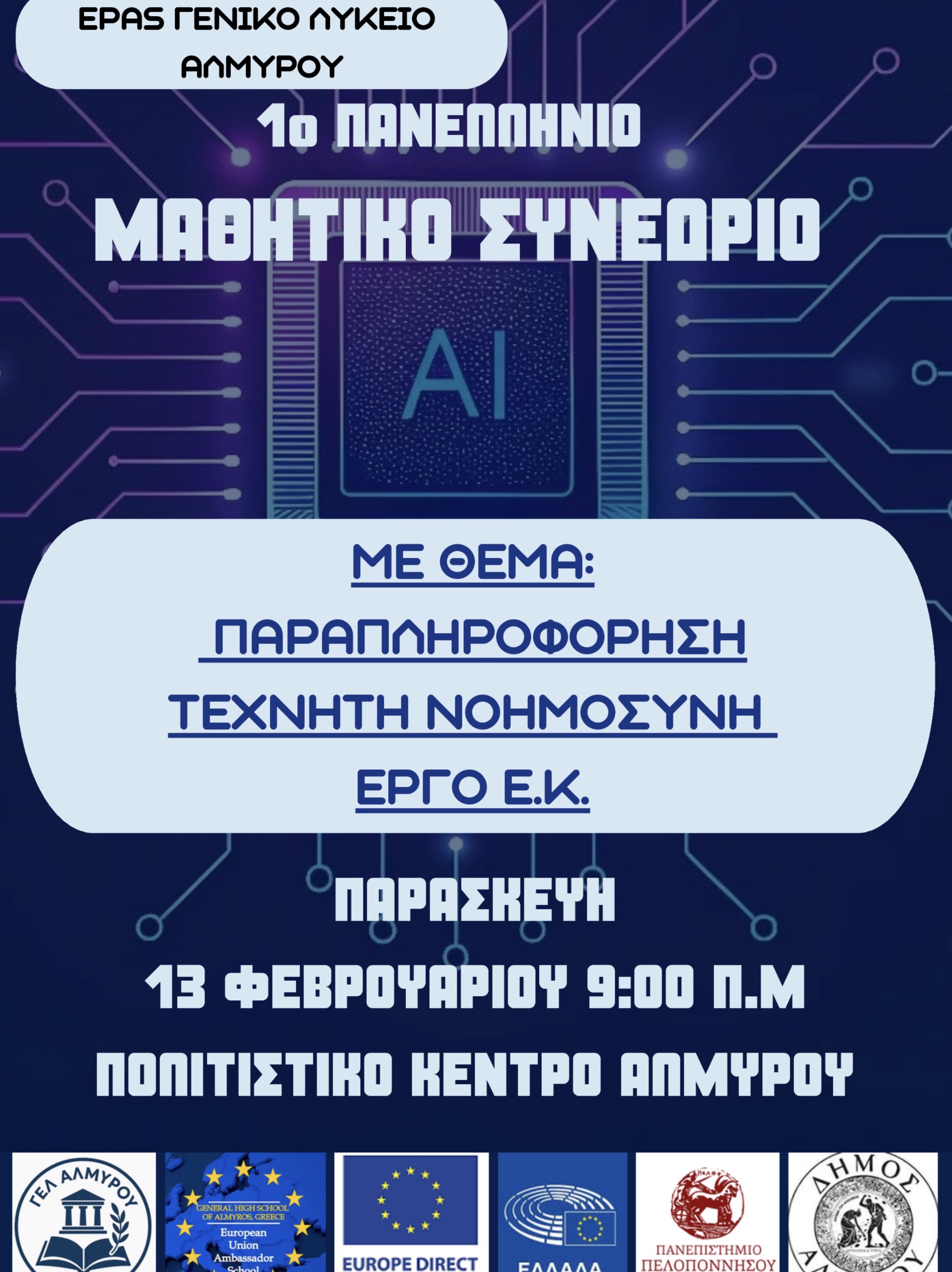 Το Γενικό Λύκειο Μούδρου συμμετείχε διαδικτυακά με ιδιαίτερη επιτυχία στο 1ο Πανελλήνιο Μαθητικό Συνέδριο με θέμα «Παραπληροφόρηση και Τεχνητή Νοημοσύνη – Το έργο του Ευρωπαϊκού Κοινοβουλίου», το οποίο πραγματοποιήθηκε την Παρασκευή 13 Φεβρουαρίου 2026 στο Πολιτιστικό Κέντρο Αλμυρού, με τη συμμετοχή σχολείων και εκπαιδευτικών φορέων από όλη την Ελλάδα.