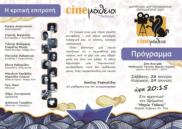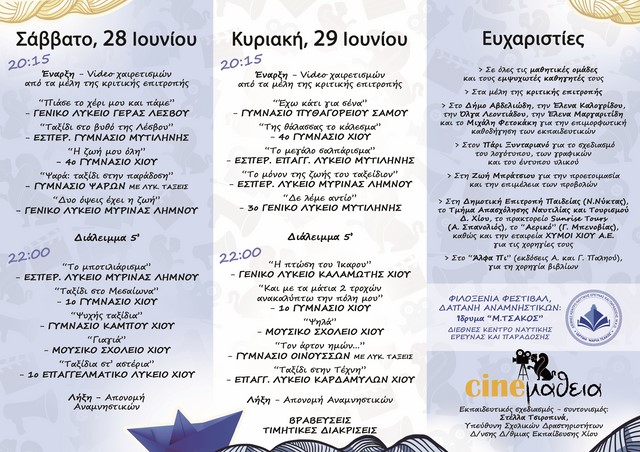 Όπως χαρακτηριστικά αναφέρει το δελτίο τύπου: «Ταινίες μικρού μήκους από τη Λήμνο, τη Λέσβο, τη Σάμο, τα Ψαρά, τις Οινούσσες και τη Χίο θα μας ταξιδέψουν στο παρελθόν και το παρόν, σε προβλήματα, όνειρα και αναζητήσεις, με καπετάνιους-κινηματογραφιστές και πρωταγωνιστές τους μαθητές και τους εκπαιδευτικούς Γυμνασίων, Γενικών και Επαγγελματικών Λυκείων των νησιών του Βορείου Αιγαίου. Ελάτε, λοιπόν, να χαρούμε μαζί αυτές τις μαθητικές ταινίες και τα ντοκιμαντέρ μικρού μήκους για να χειροκροτήσουμε όλες τις προσπάθειες που αψήφησαν το γερό κουπί και τους ανέμους, με σκοπό να πραγματοποιήσουν, αλλά και να διδαχθούν από το δικό τους ξεχωριστό ταξίδι».