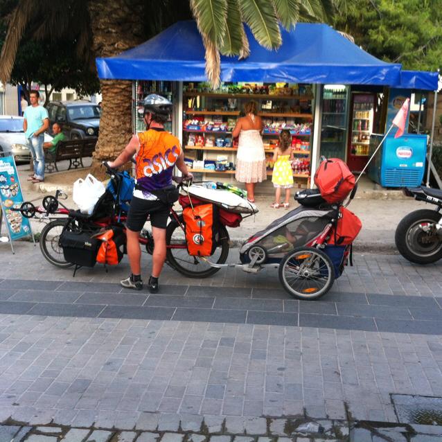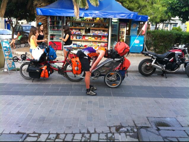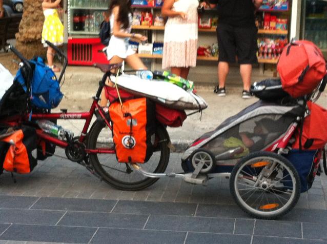 Η παρέα μεγάλη, τα ποδήλατα κλασικά, πλην ενός...οικογενειακού, όπως φαίνεται και στις φωτογραφίες. Διθέσιο το ποδήλατο (νομίζω οτι εύκολα θα γίνεται και τριθέσιο) και η μια θέση απ αυτές κάπως ιδιότυπη για την περίσταση. Ένα αναπαυτικό καρότσι - ποδήλατο που φιλοξενεί ένα 7 μηνών αγοράκι, το οποίο έδειχνε να το καταφχαριστιέται.