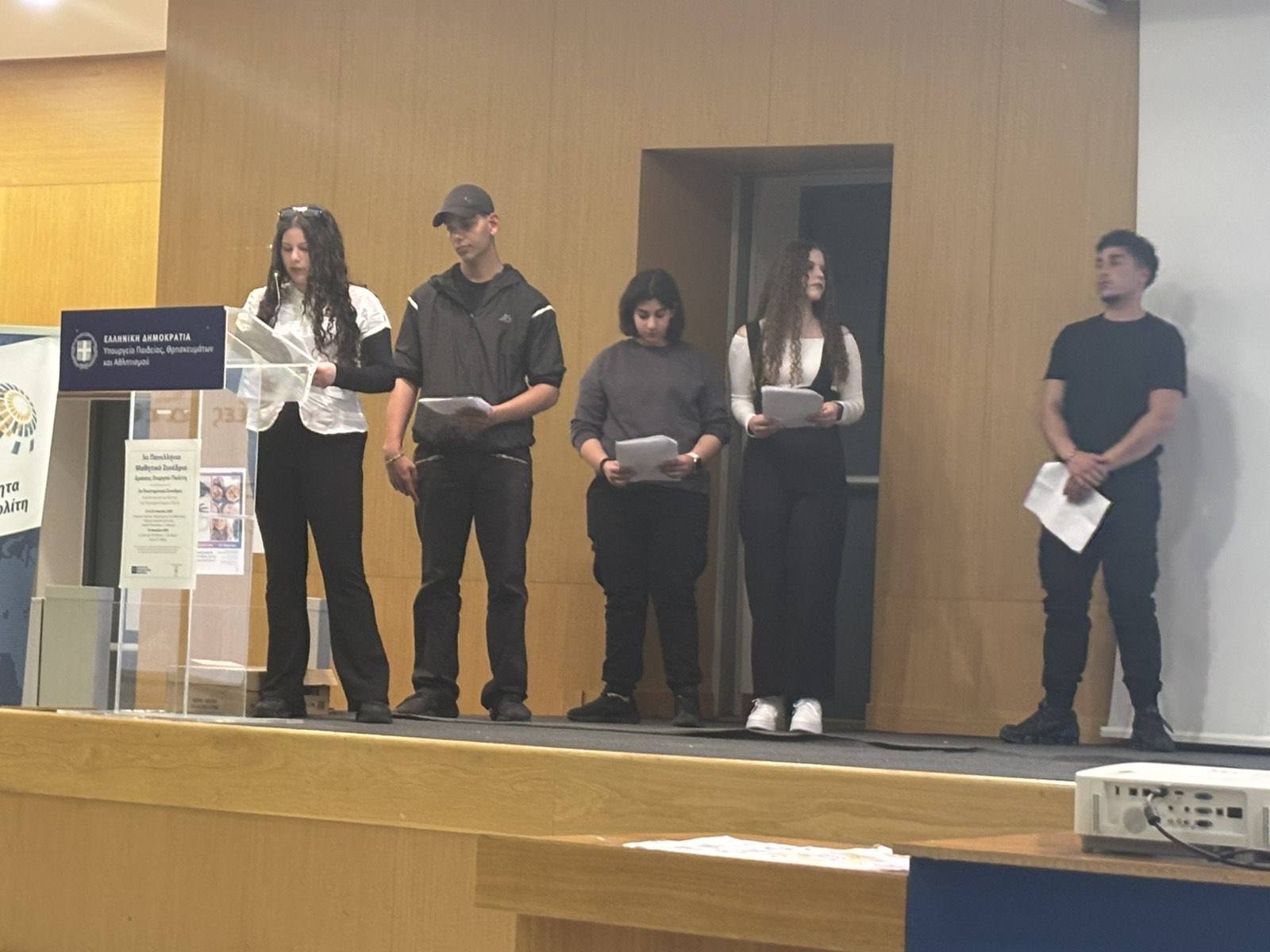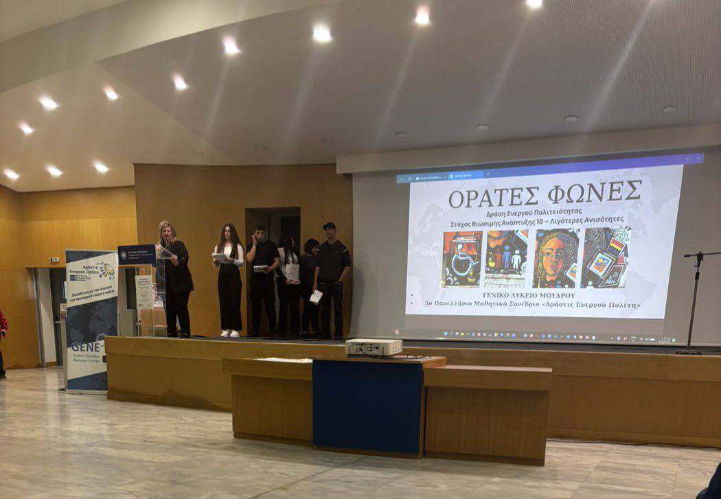 Με ιδιαίτερη επιτυχία ολοκληρώθηκε η συμμετοχή του Γενικού Λυκείου Μούδρου στο 5ο Πανελλήνιο Μαθητικό Συνέδριο «Δράσεις Ενεργού Πολίτη», που συνδιοργάνωσε το Ινστιτούτο Εκπαιδευτικής Πολιτικής και το 1ο Πρότυπο ΓΕΛ Αθηνών – Γεννάδειο με την υποστήριξη του Εργαστηρίου Παιδαγωγικής Έρευνας και Εφαρμογών, Εκπαιδευτικής Τεχνολογίας και Παραγωγής Εκπαιδευτικού Υλικού του Τμήματος Κοινωνικής Θεολογίας και Θρησκειολογίας, ΕΚΠΑ και το οποίο πραγματοποιήθηκε στο Υπουργείο Παιδείας, Θρησκευμάτων και Αθλητισμού. Την Παρασκευή 24 Απριλίου 2026, στην αίθουσα «Jacqueline de Romilly», οι μαθητές και οι μαθήτριες του σχολείου παρουσίασαν τη δράση με τίτλο «Ορατές Φωνές – Δημιουργώντας χώρο για λιγότερες ανισότητες», στο πλαίσιο της θεματικής ενότητας «Λιγότερες Ανισότητες».