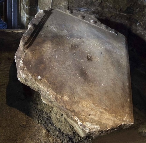 Επίσης, αποκαλύφθηκε το βόρειο τμήμα του μαρμάρινου κατωφλίου, το οποίο έχει συνολικά μήκος 2,15μ. πλάτος 1,6μ. και πάχος 0,25μ. Φέρει κυρτές βαθύνσεις, για την ένθεση των μεταλλικών τροχιών που διευκολύνουν την κίνηση των μαρμάρινων θυροφύλλων. Όπως προκύπτει από την συγκεκριμένη τομή, εδώ υπήρχε δάπεδο από πωρόλιθους, που έφεραν λευκό επίχρισμα. Εκατέρωθεν του κατωφλίου εντοπίστηκαν, κατά χώραν, οι πωρόλιθοι του δαπέδου.