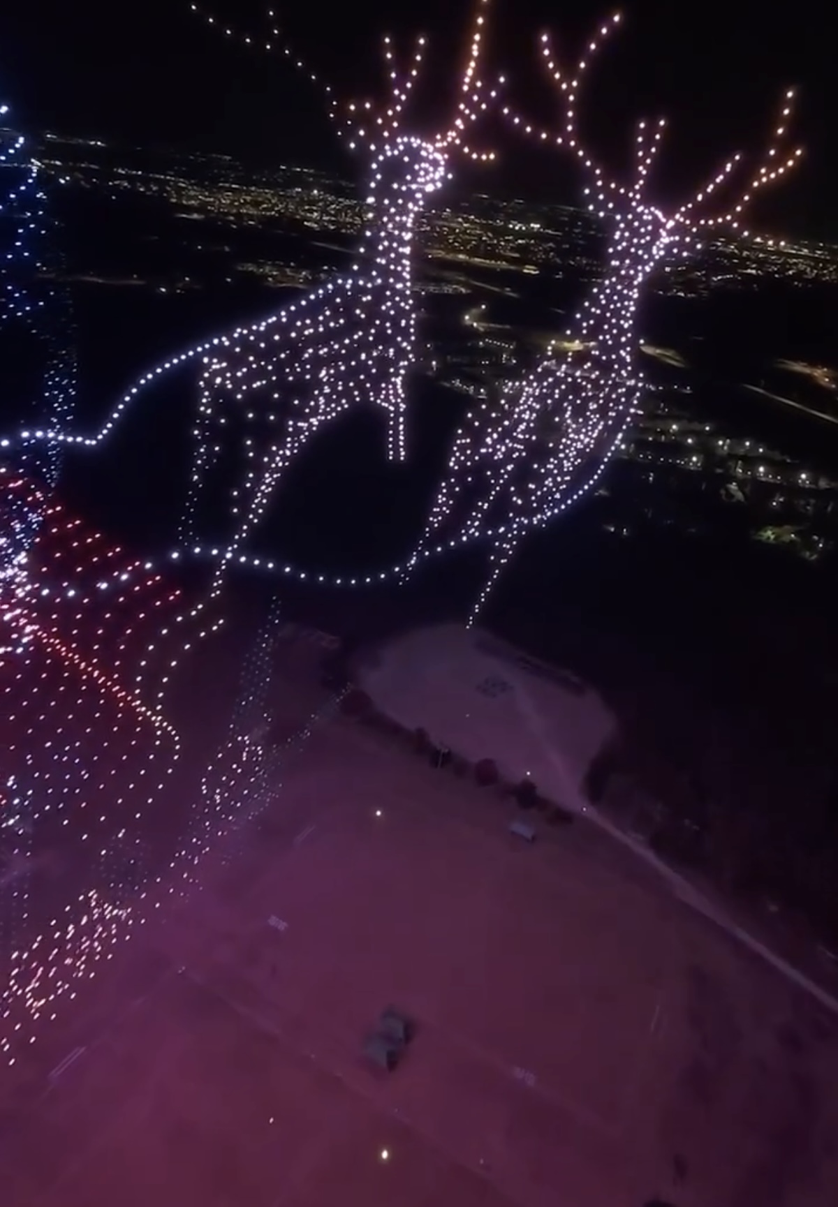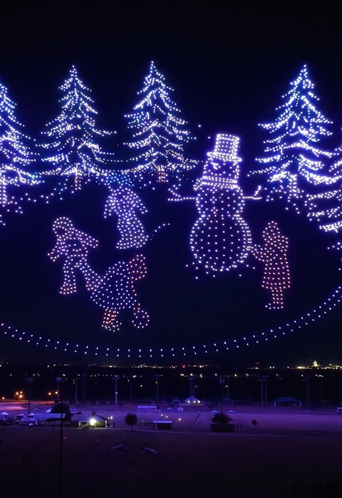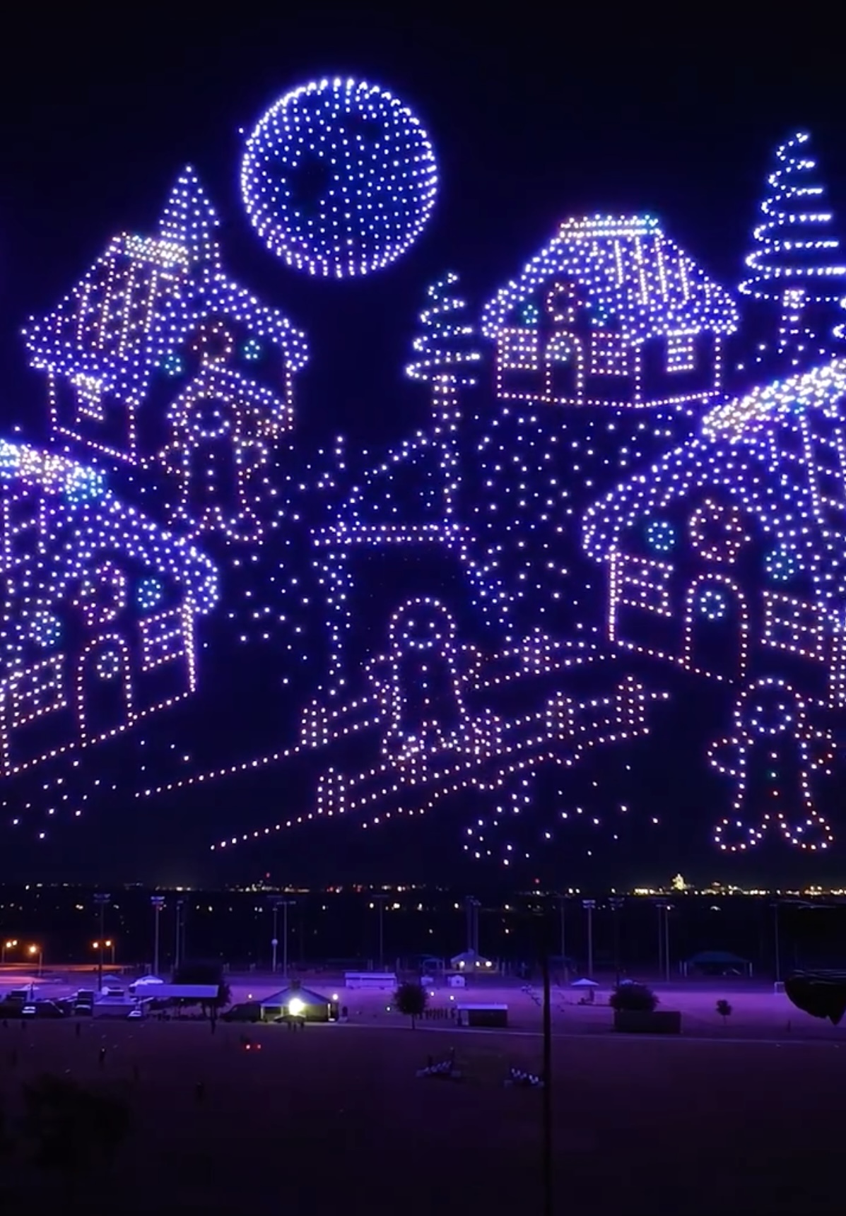 Σε αυτή την παράσταση, τα drones δημιούργησαν εναέρια σχέδια που περιλάμβαναν χιονισμένα σπίτια, δέντρα στολισμένα με λαμπιόνια και χριστουγεννιάτικες φιγούρες ενώ το ίδιο εντυπωσιακή ήταν η εικόνα που δέσποζε στον ουρανό, μια λαμπερή εικόνα της Γης.